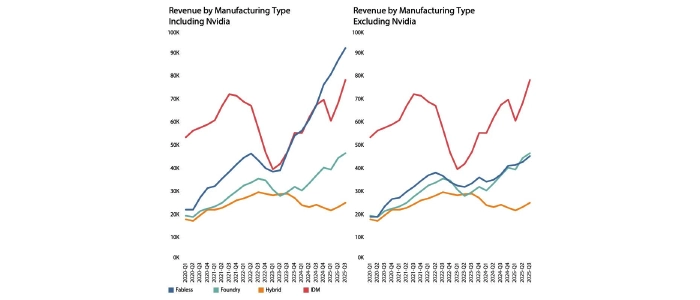 Dodanie do wykresu przychodów foundry pokazuje, że po wyłączeniu Nvidii z przychodów rynku półprzewodników trajektoria przychodów firm fabless oraz ich partnerów foundry jest bardzo zbliżona. Przychody foundry reagują z niewielkim opóźnieniem, ale rosną szybciej niż przychody firm fabless z wyłączeniem Nvidii.