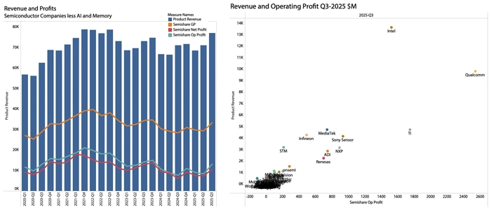Dla większości firm półprzewodnikowych kolejnym logicznym krokiem jest usunięcie z analizy zarówno Nvidii, jak i segmentu pamięci, aby zobaczyć trajektorię szerokiego rynku.