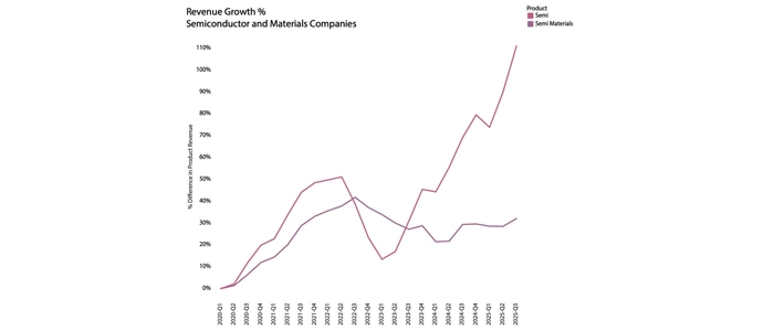 Rewolucja AI złamała klasyczny cykl półprzewodnikowy i nic nie wskazuje na szybki powrót do dawnych, „dobrych czasów”. Wzrost przychodów na poziomie całej branży jest dziś niemal w całości napędzany przez AI i nie dostarcza łańcuchowi dostaw realnych „substancji odżywczych”. Podczas gdy przychody sektora półprzewodników wzrosły w tym samym okresie o 37%, firmy z zaplecza dostawczego pozostają około 10% poniżej swoich historycznych szczytów.