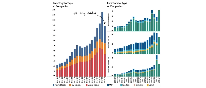 Przeniesienie uwagi na zapasy firm AI pokazuje obraz diametralnie inny. Do analizy włączyłem również zapasy Nvidii za Q4, ponieważ w ostatnim czasie ulegały one istotnym zmianom.