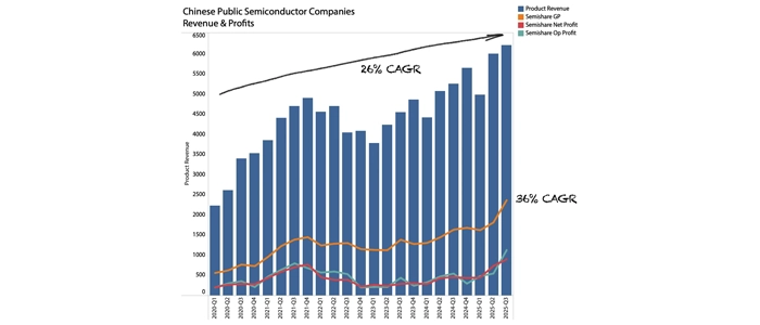 W tym samym okresie, gdy chiński rynek wewnętrzny pozostawał słaby, notowane na giełdzie chińskie spółki półprzewodnikowe przeżywały prawdziwy boom. Ich przychody rosły ze średnioroczną stopą przekraczającą 26%, podczas gdy łączne przychody firm tworzących rdzeń rynku półprzewodników zwiększały się w tym czasie o mniej niż 3%.