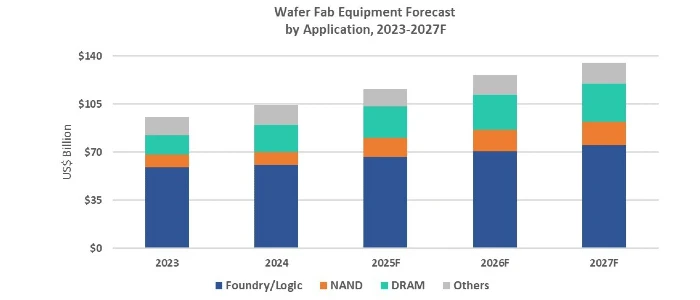 Oczekuje się, że sprzedaż sprzętu WFE dla zastosowań w odlewniach i logice wykazuje solidny wzrost o 9,8% rok do roku, osiągając wartość 66,6 miliardów dolarów w 2025 r., wspierana przez stabilne wydatki na zaawansowane węzły. Prognozuje się, że segment ten odnotuje wzrost o 5,5% w 2026 r. i o 6,9% do 75,2 miliardów dolarów w 2027 r., ponieważ producenci chipów zwiększają moce produkcyjne w zakresie akceleratorów AI, komputerów o wysokiej wydajności i procesorów mobilnych klasy premium. Inwestycje będą w coraz większym stopniu ukierunkowane na najnowocześniejsze technologie, ponieważ branża zmierza w kierunku produkcji wielkoseryjnej w węźle 2 nm gate-all-around (GAA).